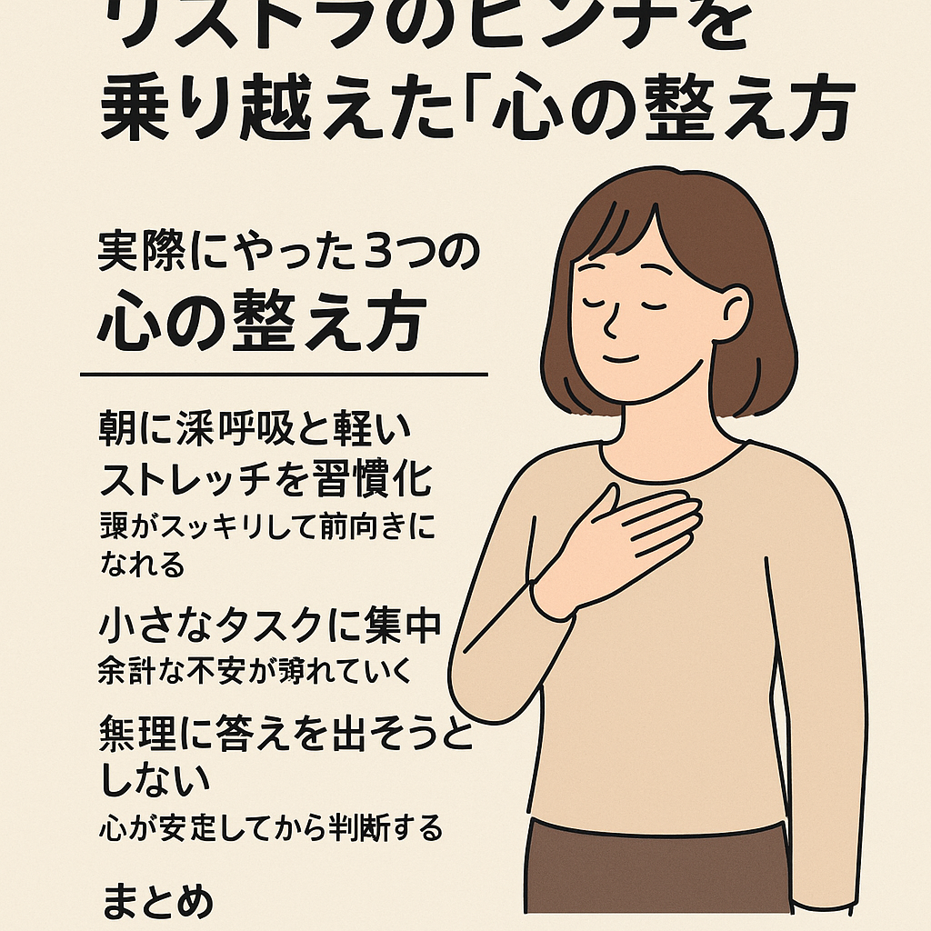 体を動かすことで、頭がスッキリしてきます。呼吸を意識するだけでも、自律神経が整って「なんとかなるかも」と思えるようになりました。 - 小さなタスクに集中